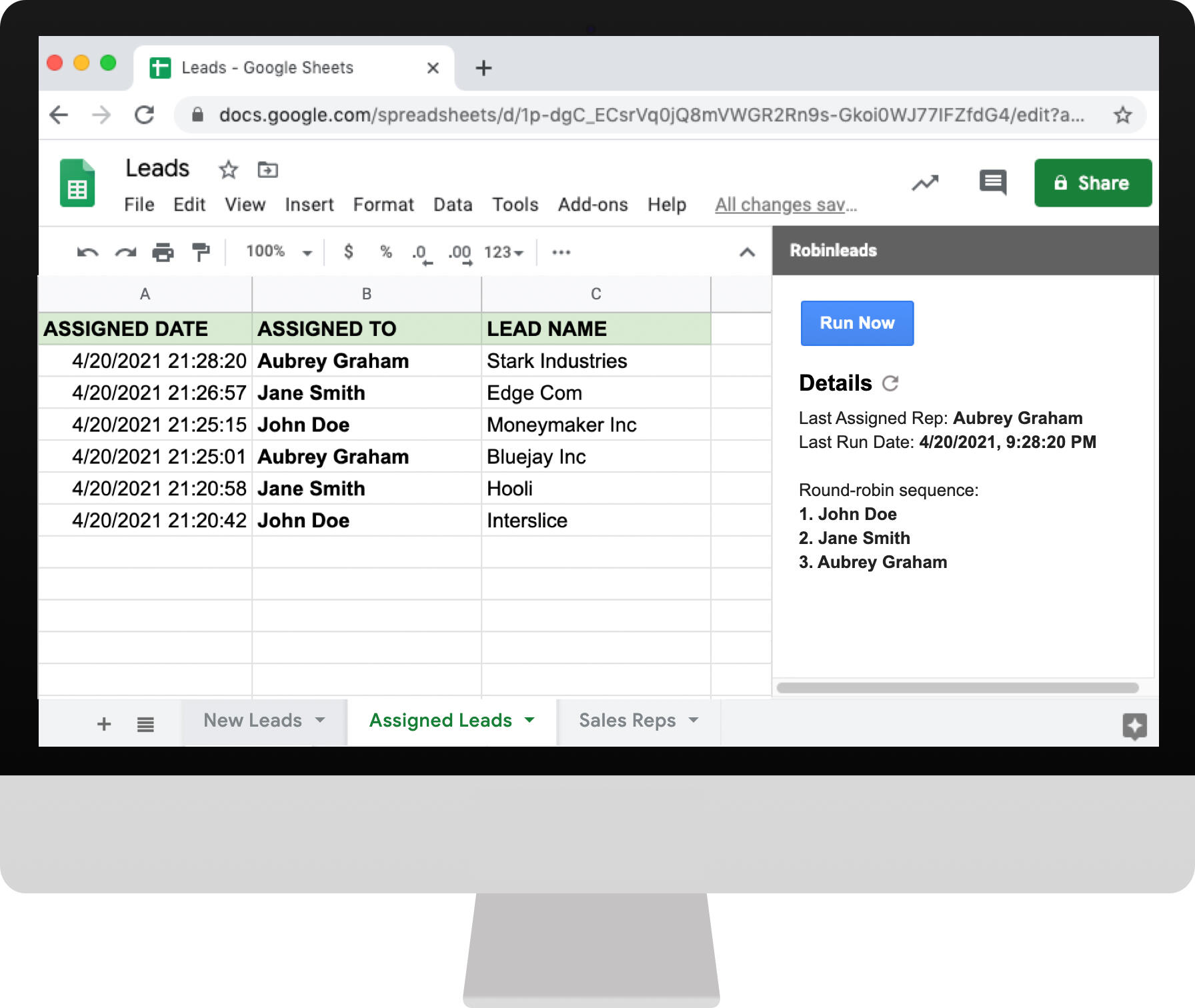 Since Robinleads runs inside Google Sheets, you can use Zapier to automatically create and round-robin new leads or trigger a Zapier action in another app.Here are a few examples: